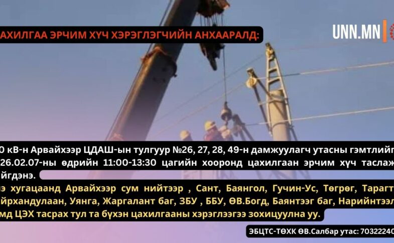110 кВ-н Арвайхээр ЦДАШ-ын тулгуур №26, 27, 28, 49-н дамжуулагч утасны гэмтлийг 2026.02.07-ны өдрийн 11:00-13:30 цагийн хооронд цахилгаан эрчим хүч таслаж хийгдэнэ....