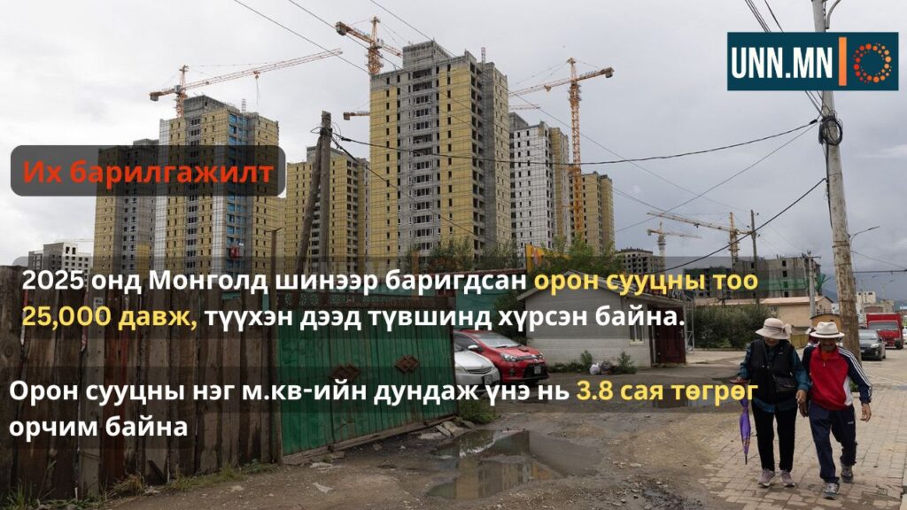 ҮСХ-ны мэдээллээр барилга угсралт, их засварын ажлын гүйцэтгэл 2025 онд 11.7 их наяд төгрөг болсон нь 2024 оноос 28 хувиар өсөж, мөн л түүхэн дээд түвшинд тооцогдож байна. 2025 оны IV улирлын байдлаар 61.2 мянган шинэ орон сууцны нийлүүлэлт хийгдсэнийг Тэнхлэг зууч компани мэдээлж байна. Үүний 70.4 хувь нь стандарт зэрэглэлийн орон сууц бөгөөд нэг м.кв-ийн дундаж үнэ нь 3.8 сая төгрөг орчим байна.