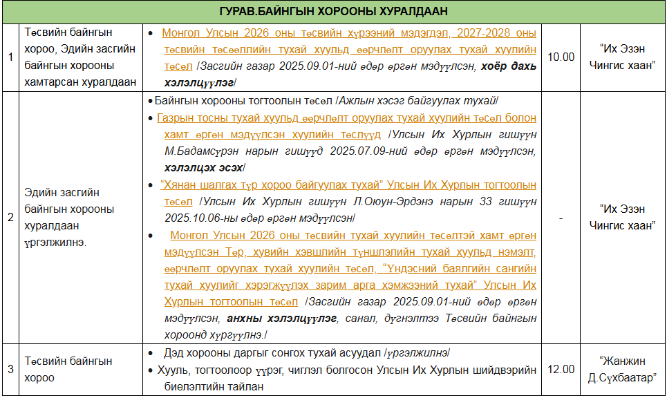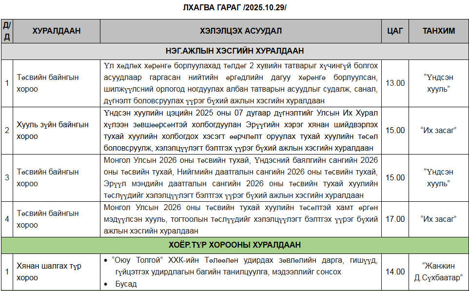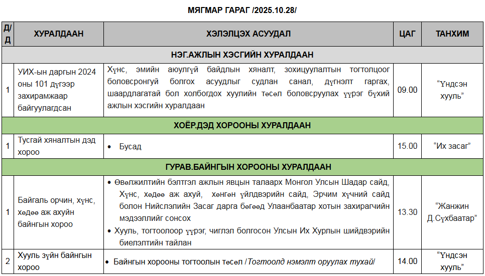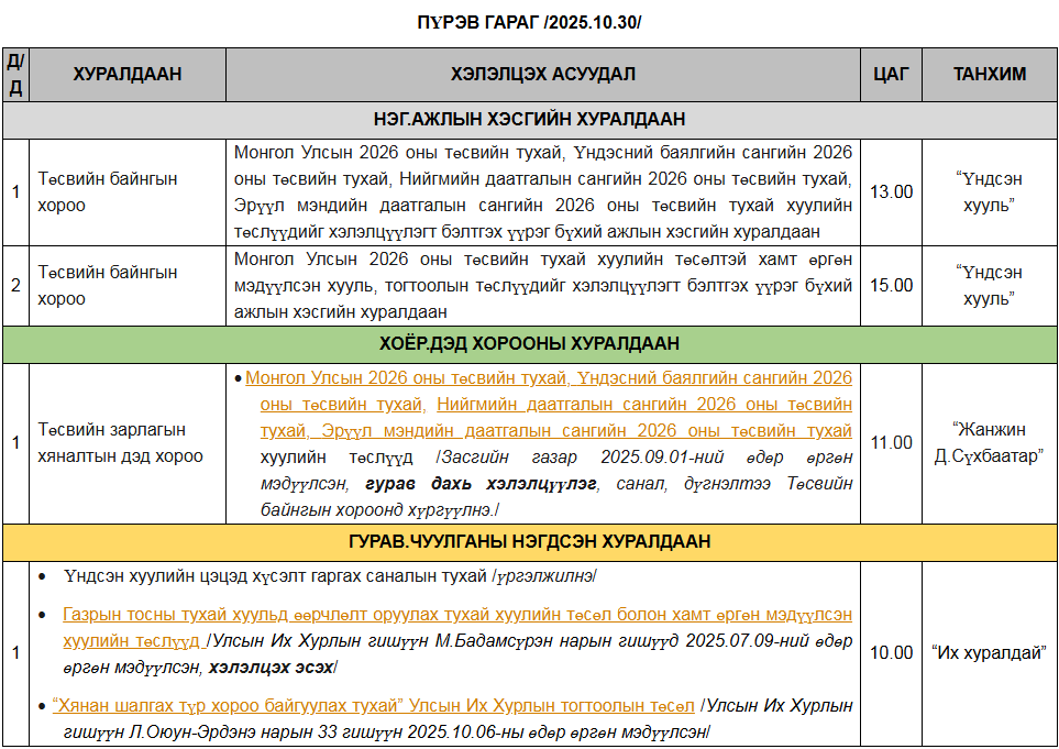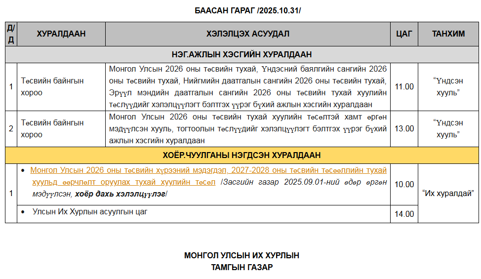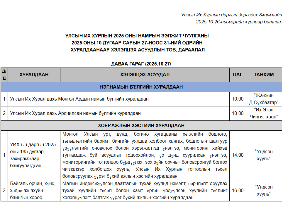 УЛСЫН ИХ ХУРЛЫН 2025 ОНЫ НАМРЫН ЭЭЛЖИТ ЧУУЛГАН: Хэлэлцэх асуудал, тов, дараалал 2025.10.27-10.31otgooOctober 26, 2025Uncategorized Эх сурвалж: ParliamentMN