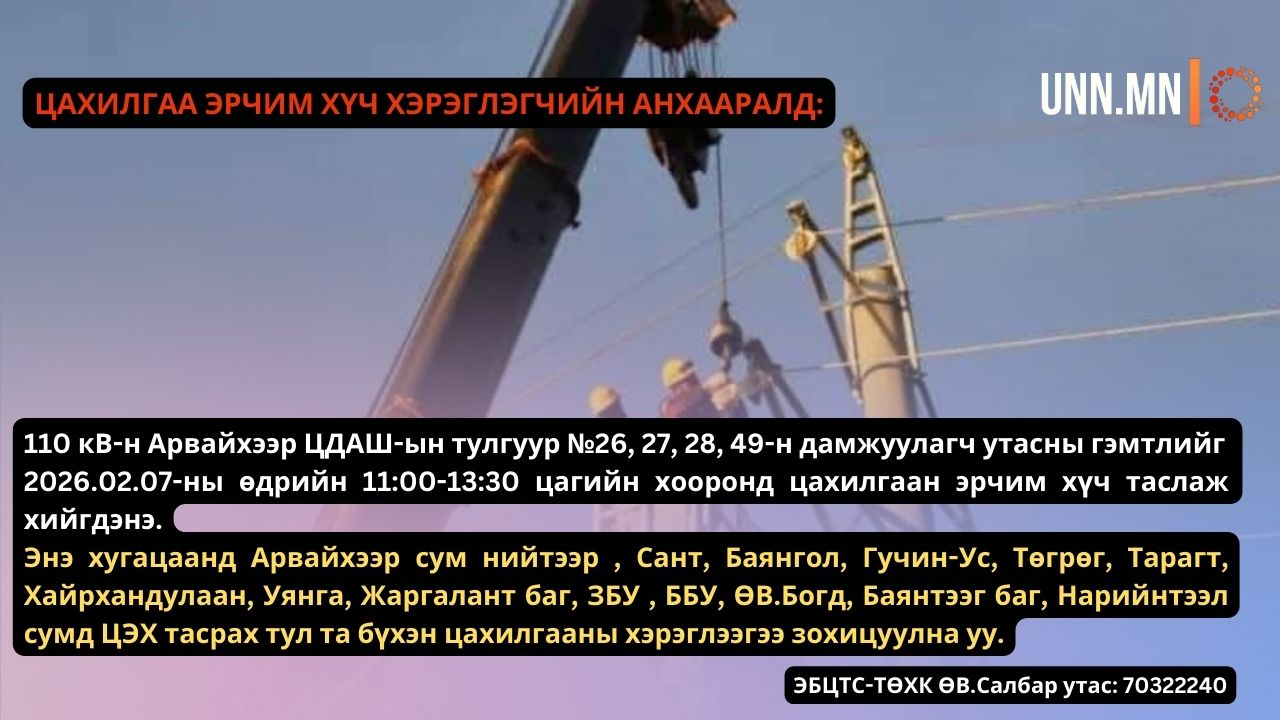 2026.02.07-ны өдрийн 11:00-13:30 цагийн хооронд цахилгаан эрчим хүч таслаж хийгдэнэ.