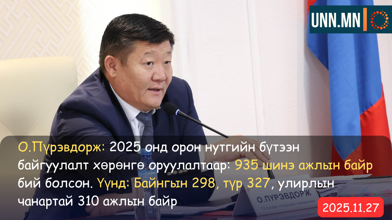 О.Пүрэвдорж: 2025 онд орон нутгийн бүтээн байгуулалт хөрөнгө оруулалтаар: 935 шинэ ажлын байр бий болсон.