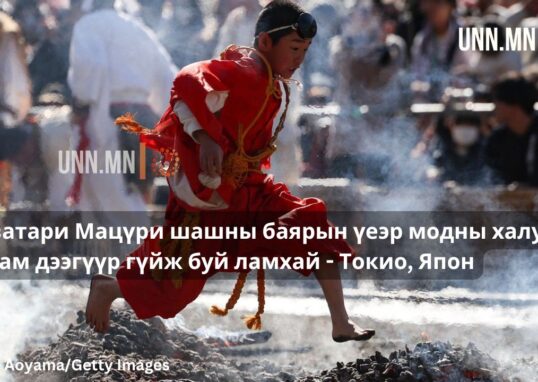 Хиватари Мацүри шашны баярын үеэр модны халуун нурам дээгүүр гүйж буй ламхай – Токио, Япон