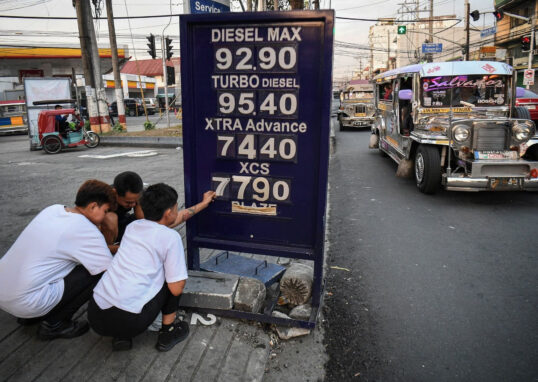Шатахуун түгээх станцын самбар дээрх үнийг өөрчилж буй ажилчид – Манила, Филиппин Ted Aljibe/AFP/Getty Images